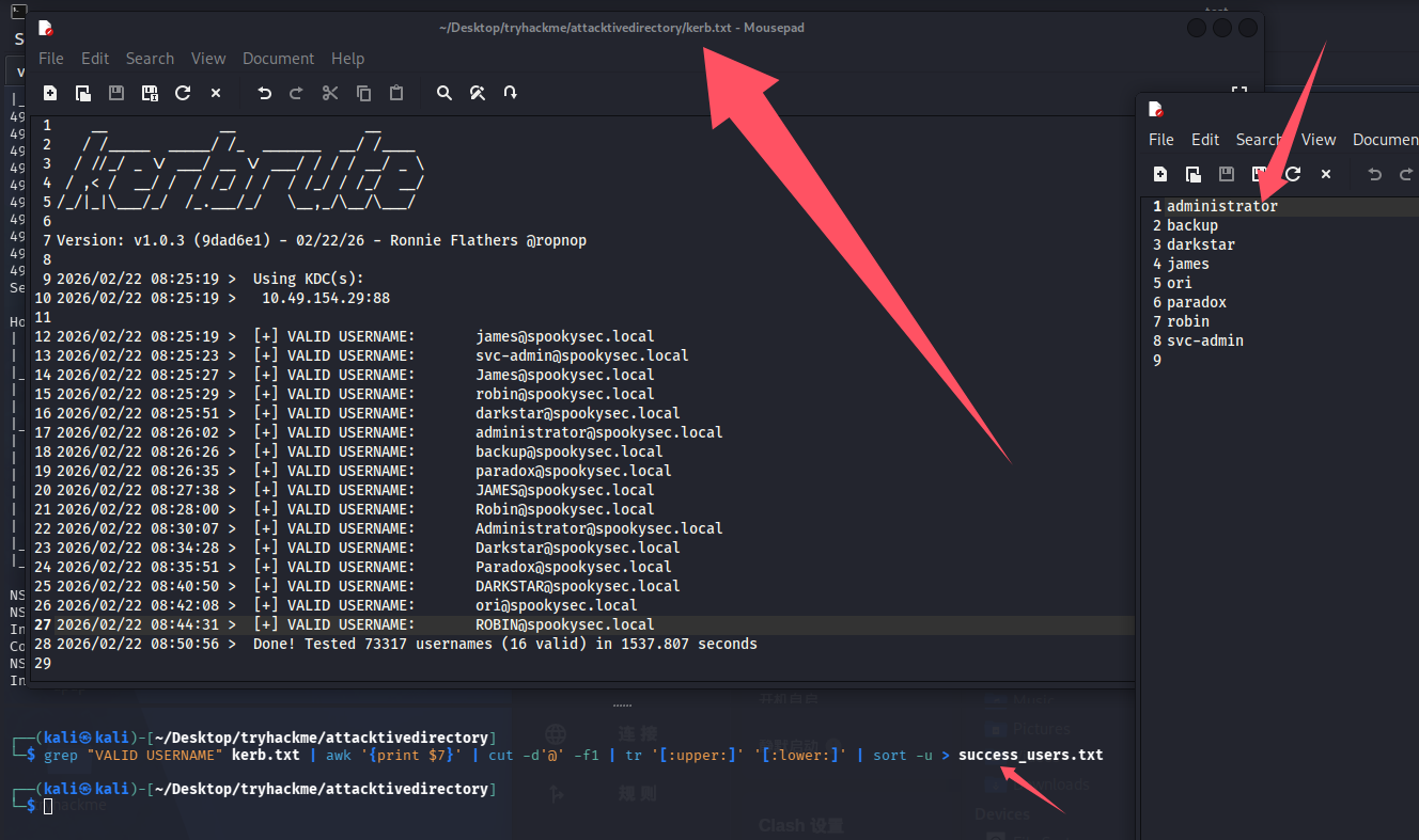 获取到用户量太大,处理一份用户名字典处理,先把 kerbrute 的结果写入 kerb.txt,在处理数据