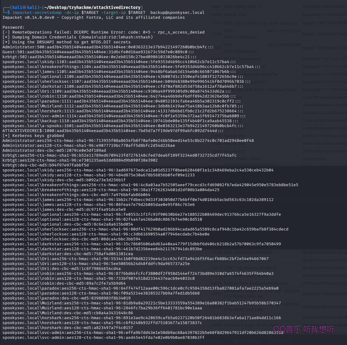 由于我们有了备份用户的明文凭证,猜测其滥用 Active Directory 的复制机制(MS-DRSR 协议),可以完成 DCSync 攻击,利用 secretsdump 可以拿到全部 hash