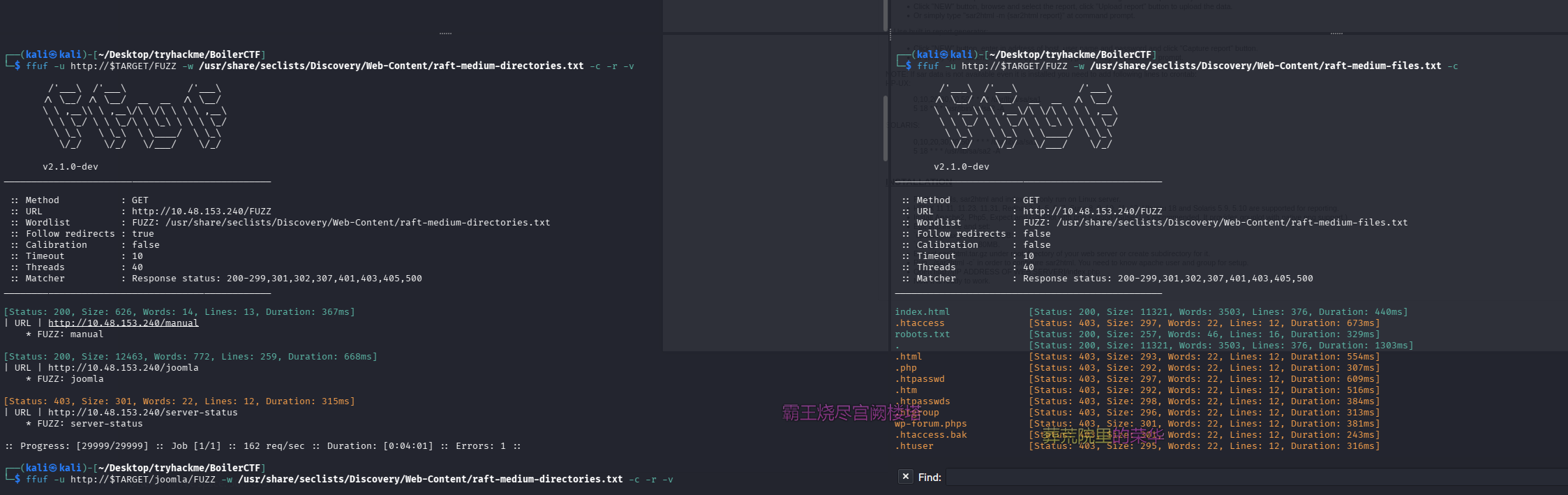 ffuf -u http://$TARGET/joomla/FUZZ -w /usr/share/seclists/Discovery/Web-Content/raft-medium-directories.txt -c -r -v -fw 2