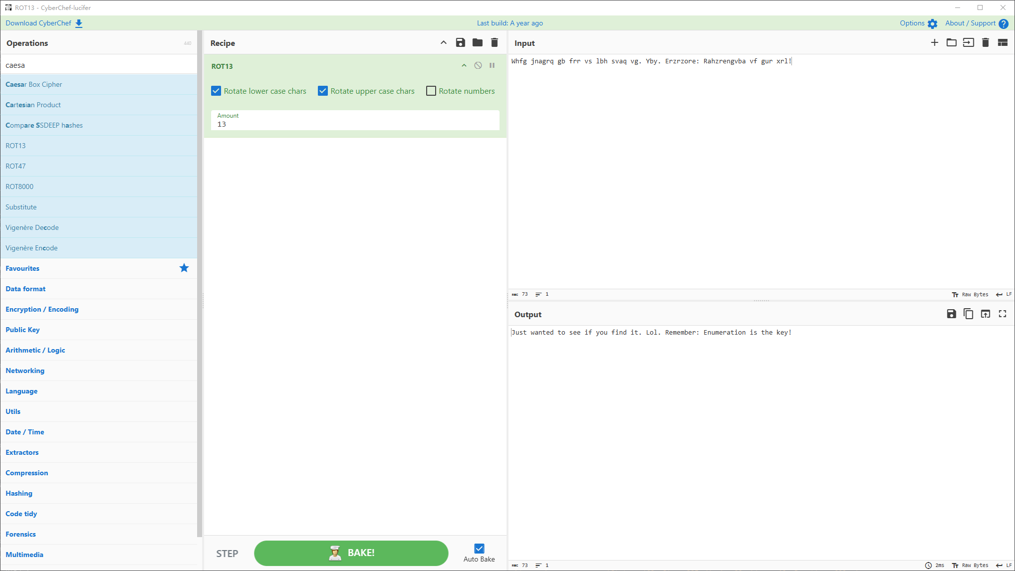 根据做 CTF 的经验,看上去像一段位移过的加密,推测为凯撒或变种,启动 cyberchef,最终用 rot13 解密成功