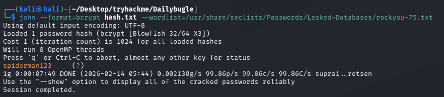 john --format=bcrypt hash.txt --wordlist=/usr/share/seclists/Passwords/Leaked-Databases/rockyou-75.txt