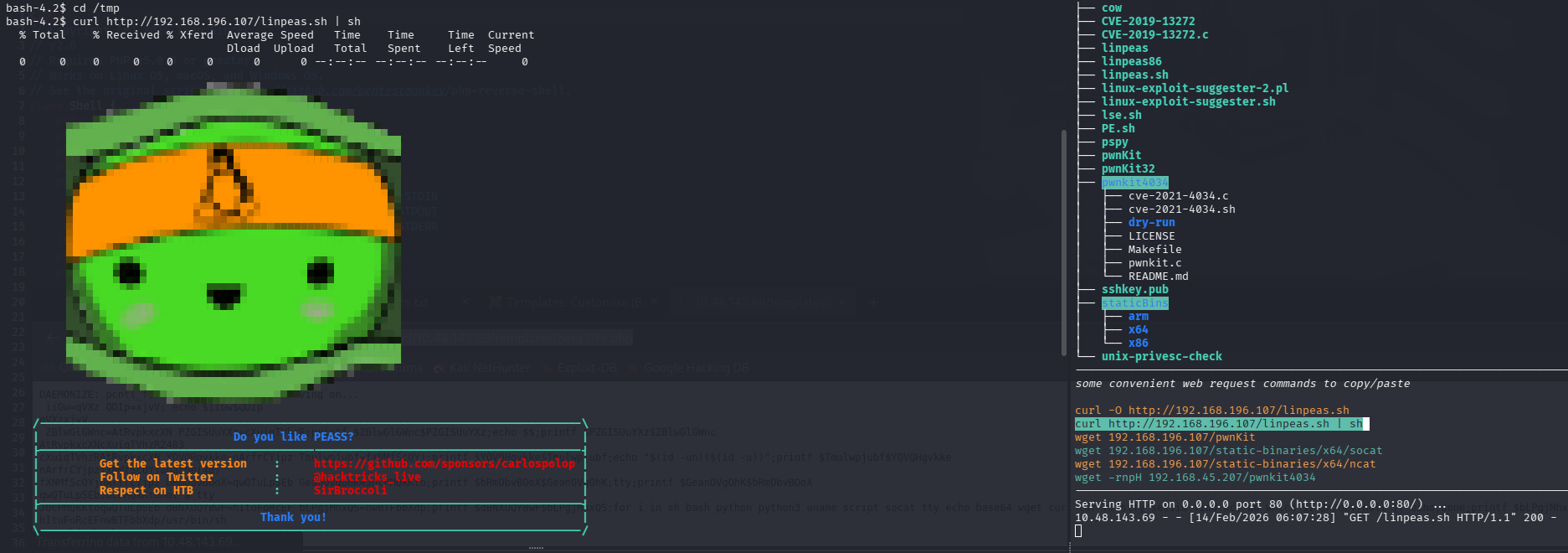 lpe 开启,靶机 shell 内拉 linpeas 跑一下
