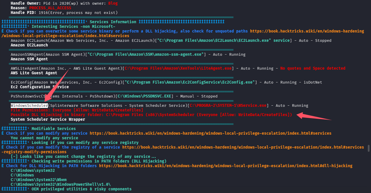 两个问题引导我们利用这个服务来完成 dll 劫持,但是把。。。翻了翻 winPEAS.exe 的输出,你猜这是什么?