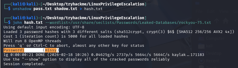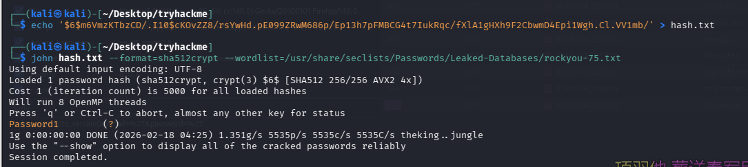 john hash.txt --format=sha512crypt --wordlist=/usr/share/seclists/Passwords/Leaked-Databases/rockyou-75.txt