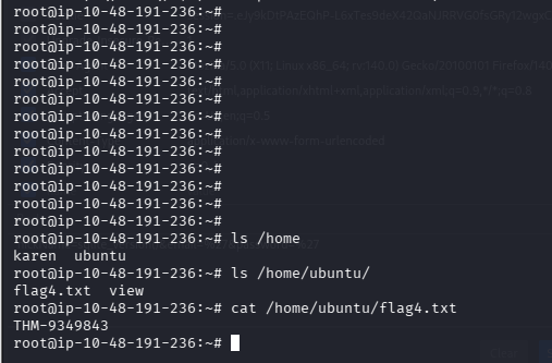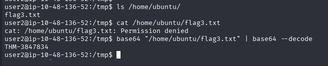 切到 user2 发现没有家目录,找了找原来 flag3.txt 在 Ubuntu 的家目录,user2 也没权限读取,那还是用 base64 提权读取吧 base64 "/home/ubuntu/flag3.txt" | base64 --decode