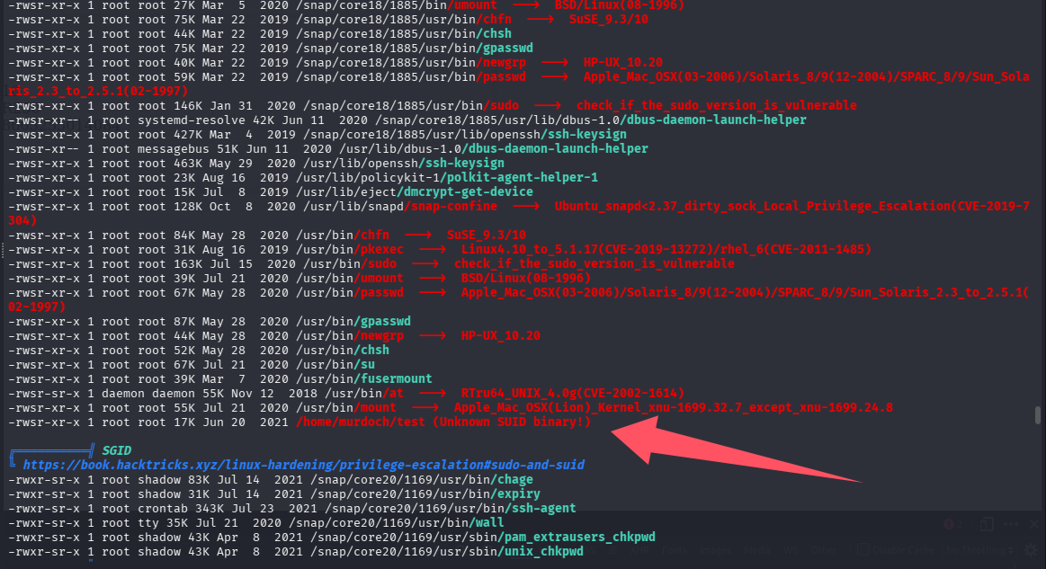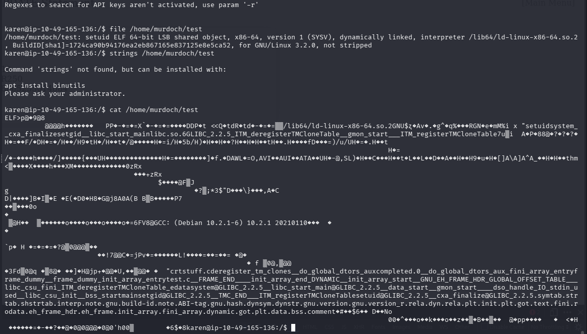 发现一个未知的 SUID 程序/home/murdoch/test,检查一下,直接 cat 乱码太多